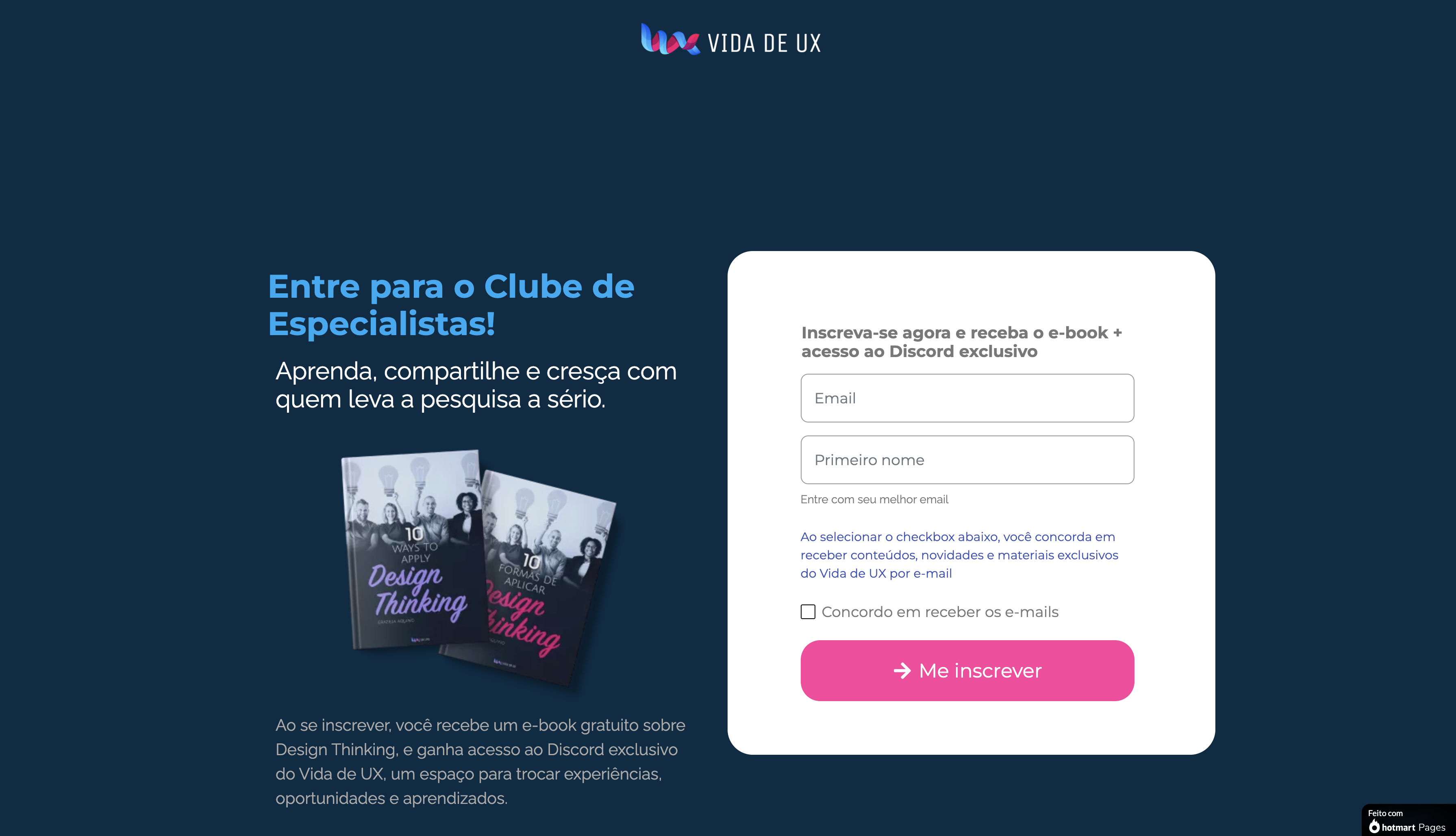 Ao se inscrever, você recebe um e-book gratuito sobre Design Thinking, e ganha acesso ao Discord exclusivo do Vida de UX